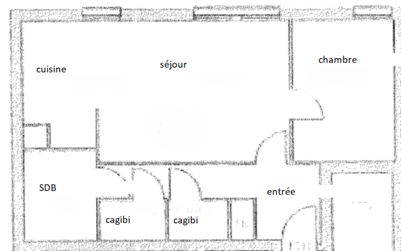 une entrée avec placard, un séjour, une cuisine ouverte, une chambre, un couloir desservant deux cagibis, une salle de bains avec WC..