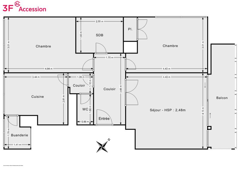 Cet appartement de 67,8 m² comprend un séjour, une cuisine, deux chambres, une salle de bains et un WC.
