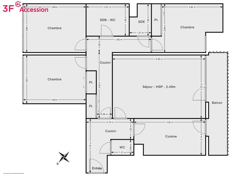 Ce logement de 81 m² comprend un salon, une cuisine fermée, trois chambres , une salle de bains et une salle d'eau.